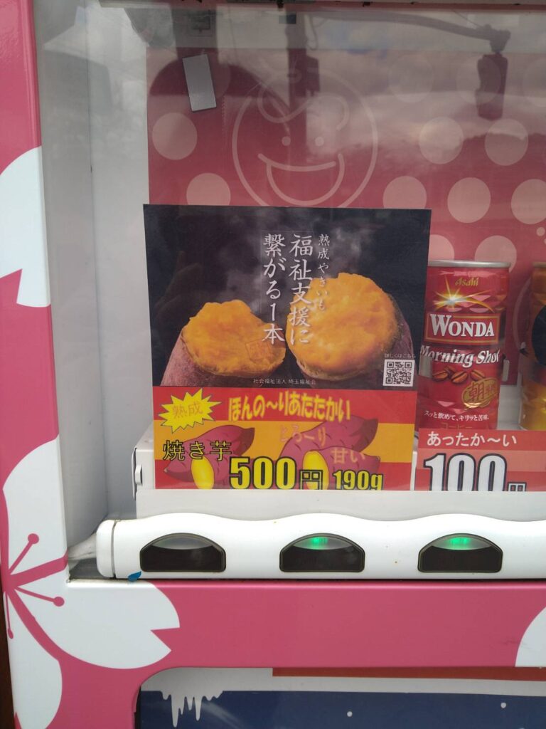 2023年1月11日飛鳥山交番の交差点に、焼き芋の自販機があります!最近は、考えられないようなものが自販機で売っていますね。 お芋には「福祉支援に繋がる」とありました。今度、調べてみたいと思います。管理人 コメントを書き込んでみましょう!