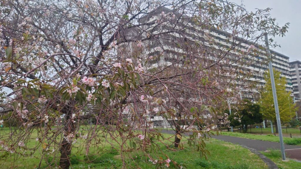 土手沿いの道(ビバホームの近く)に、三本ほどの桜が咲いていますので、ご覧になってみてはいかがでしょうか?