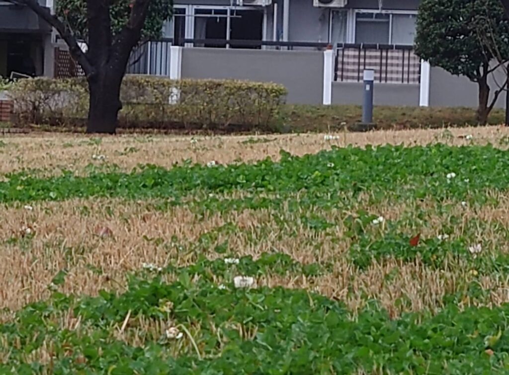 クローバーの花が咲き始めました。シロツメグサが正式名称です。四つ葉のクローバー探しは皆さんやられましたか?