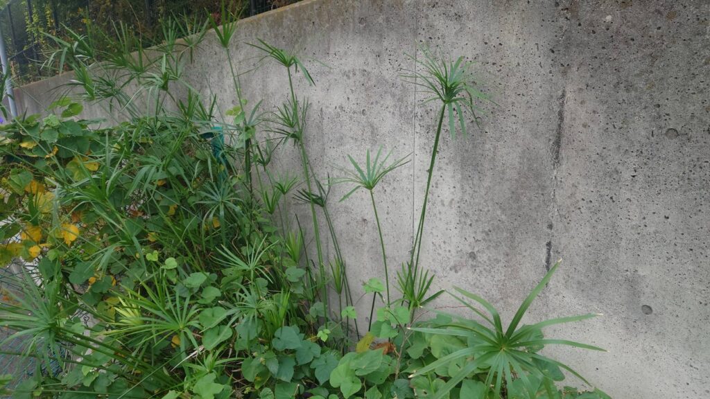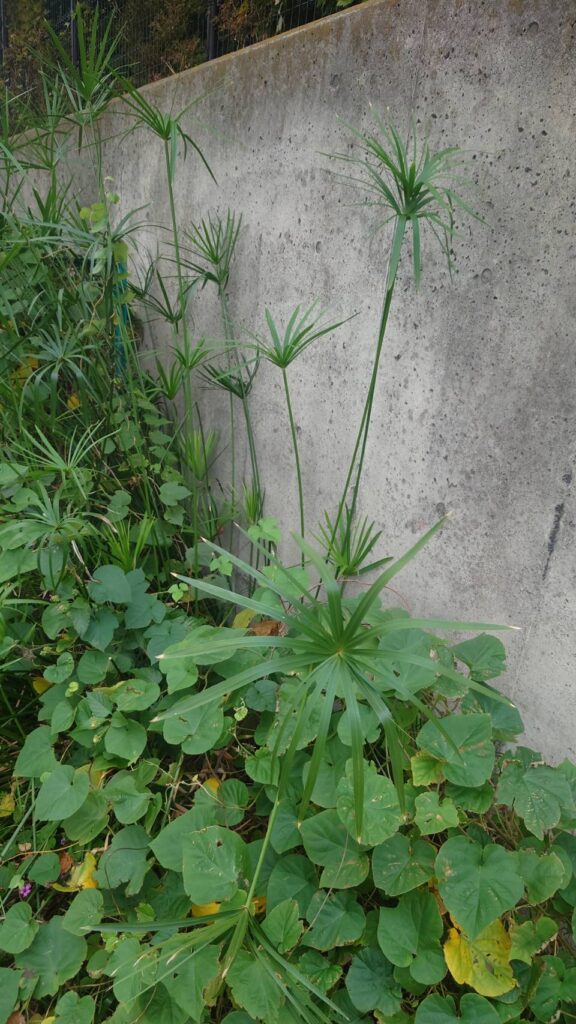 年明けから寒い日が続いていますが、団地の端の芝生では、シュロガヤツリと思われる草を見つけました。