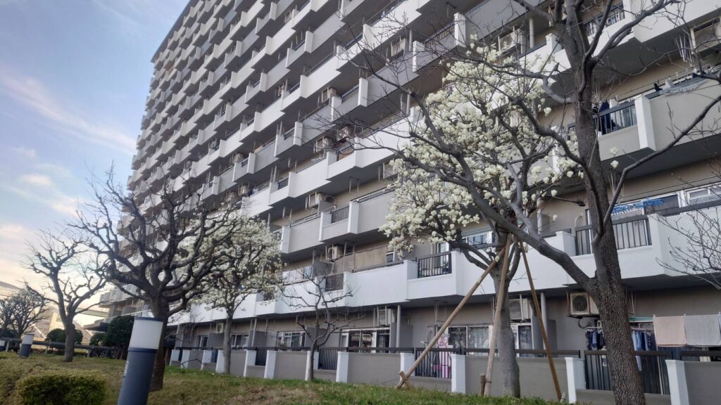 団地の敷地内には、白い木蓮(ハクモクレン)がたくさん植えてあります。