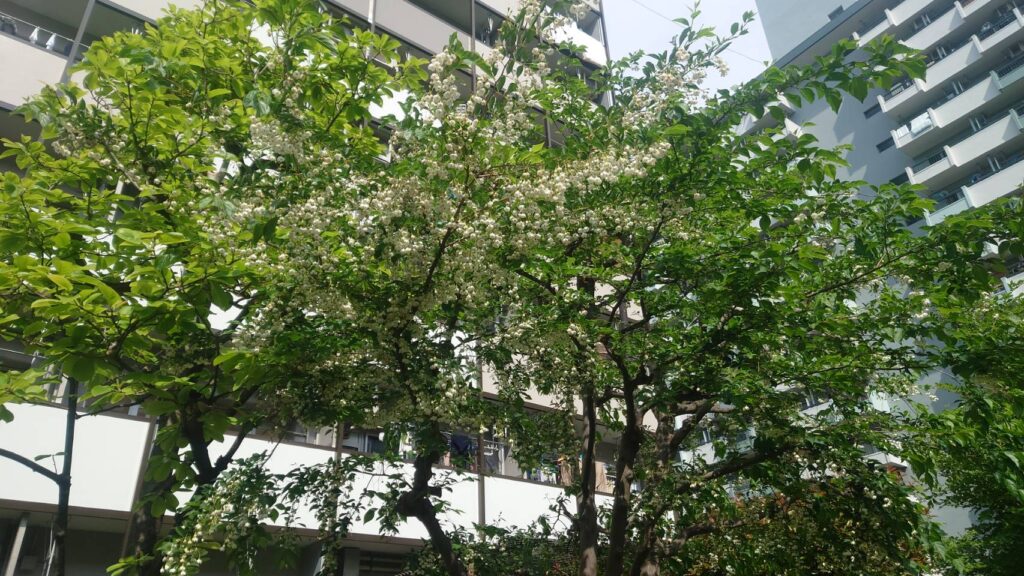 白い花がたくさん咲いているこの木は、シロバナフウリンツツジという木だそうです。花を良く見ると、確かに風鈴のような白い花が咲いています。