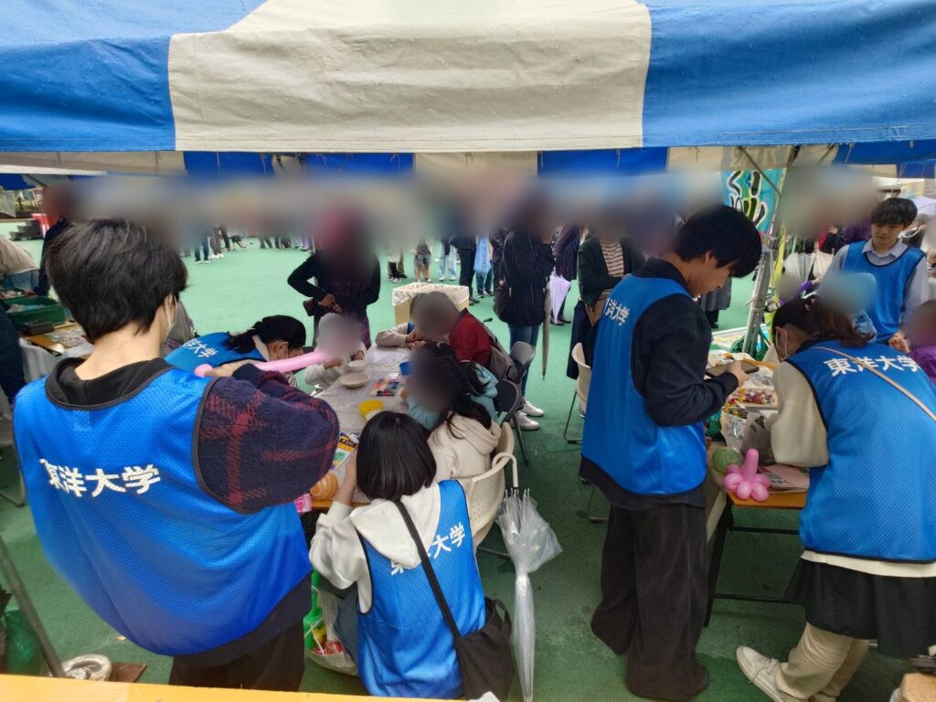 東洋大学のブースでは、ビーズのアクセサリー作り、レゴブロック遊び、バルーンアート作りが行わない、大盛況でした。