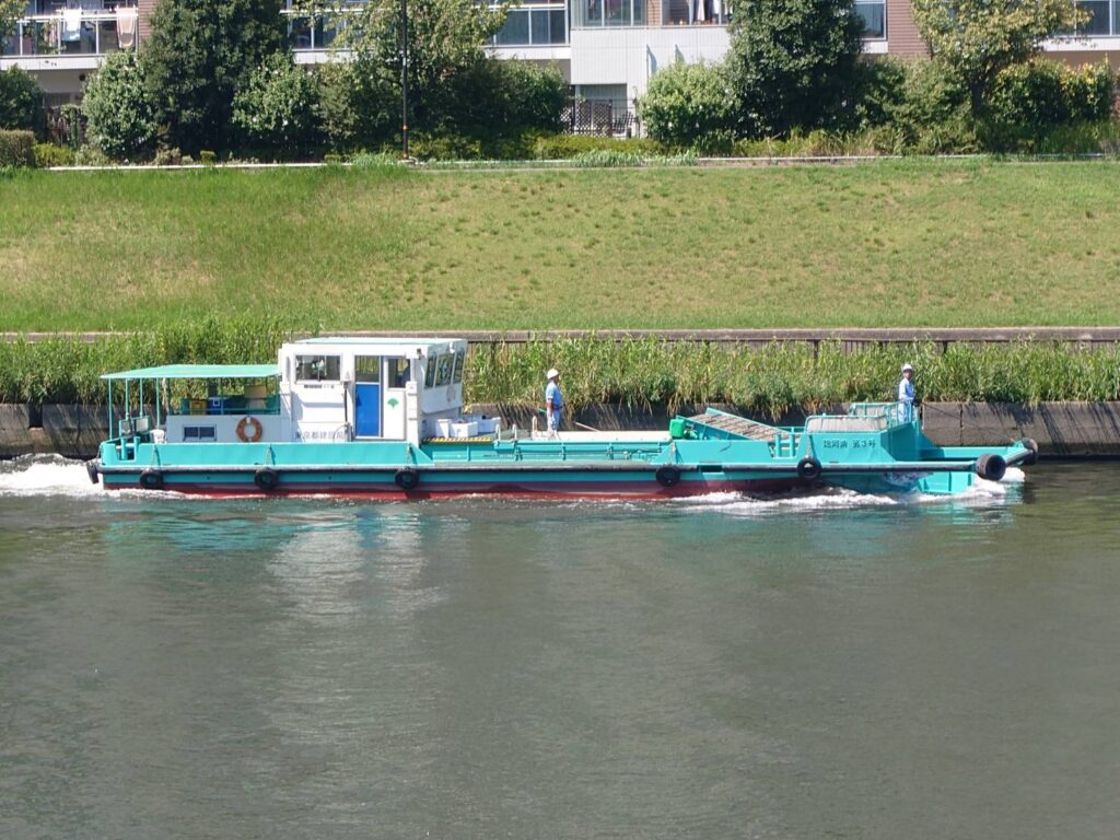 水面に浮いているペットボトルやビニール袋、カップ麺の容器などを回収していて、東京都建設局の船ということが分かりました。