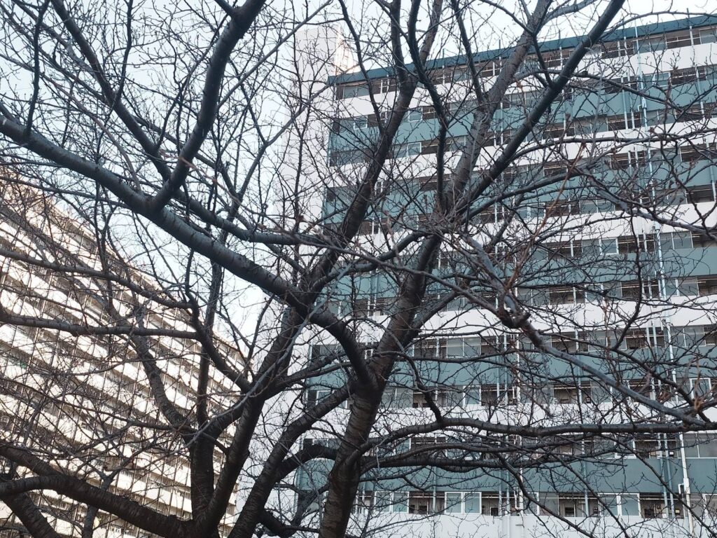 団地の桜は、まだ冬ごもり中。